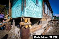 Жительница улицы Первомайской села Высокогорск Тамара Маркина 35 лет проработала в детском саду воспитателем, была заведующей. А сейчас она на пенсии, живет одна. Сегодня с помощью длинной железной балки-рычага поднимала угол крыльца, он теперь держится на бревне и кирпиче, веранда тоже на подпорке стоит.