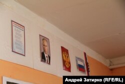 В коридоре выставлена батарея бутылок с водой, напротив – куча пакетов с вещами. Местные разбирают эти завалы – выбирают себе одежду. В полузаброшенном актовом зале опять разруха и гуманитарка – с десяток мешков картошки, вода. На обшарпанной стене – портрет Путина, текст гимна, фото флага и герб.