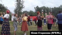 В это время на "Обрядовой поляне" шли свои мастер-классы. Тут можно было, например, вспомнить о старинных народных играх и самим в них поучаствовать.