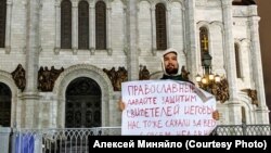 Миняйло провел пикет в Москве, у храма Христа Спасителя. Он призвал православных защитить Свидетелей Иеговы.