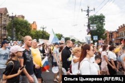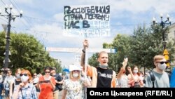 В Хабаровске сегодня около 27 градусов – довольно жарко, но колонна уверенно возвращается на площадь перед зданием правительства региона – митинговать. В общей сложности митинг на сей раз продолжался около пяти часов. Помимо лозунгов "Свободу Фургалу", "Я/Мы – Сергей Фургал", "Хабаровск своих не бросает" все чаще звучали "Путин – вор", "Чемодан – вокзал – Самара", "Дегтярев – иди в баню".