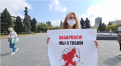 Акция солидарности с Хабаровском прошла сегодня в центре Новосибирска. Как сообщает корреспондент Сибирь.Реалии, 6 человек вышли на одиночные пикеты. Соблюдая между собой дистанцию, держат в руках плакаты с надписями "Путин вор", "Хабаровск, мы с тобой", "Спасите Байкал". Полиция предупреждала протестующих о необходимости соблюдать правила одиночного пикетирования, но в происходящее не вмешивалась. Присутствовали и вооружённые сотрудники Росгвардии. Еще около 40 человек собрались на постаменте монумента и общаются между собой.
