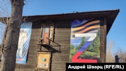 Буква войны появилась на старом ветхом бараке в отдаленном микрорайоне Новосибирска – Затоне. Баннер с лозунгом – "Za победу!" – висит рядом с огромным рекламным плакатом местного депутата, руководителя Сибирского межрегионального координационного совета партии "Единая Россия" Виктора Игнатова.