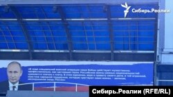 Плакат с цитатой из высказываний Владимира Путина появился на одном из домов в кемеровском Белово. "Поле битвы, на которое нас позвала история, это поле битвы за нас самих. За большую и историческую Россию, за будущие поколения" – слова Путина, которые он произнес на церемонии, венчающей аннексию оккупированных частей Украины в 2022 году.