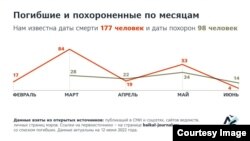 Дата смерти указана в 108, а дата похорон — в 98 некрологах. Из них следует, что в феврале убито 17 военных, в марте — 84, в апреле — 19, в мае — 53, в июне — 4. В марте республика несла самые большие потери, а больше всего гробов в Бурятию пришло в мае. Всю весну контрактников хоронили практически каждый день.